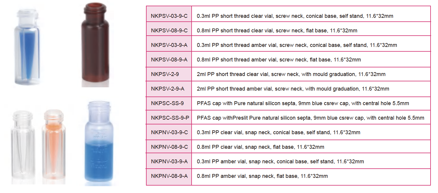 | NKPSV-03-9-C | 0.3mL Clear PP Short Screw Micro-Vial, 9mm Thread, 11.6*32mm | 100pcs/box | |